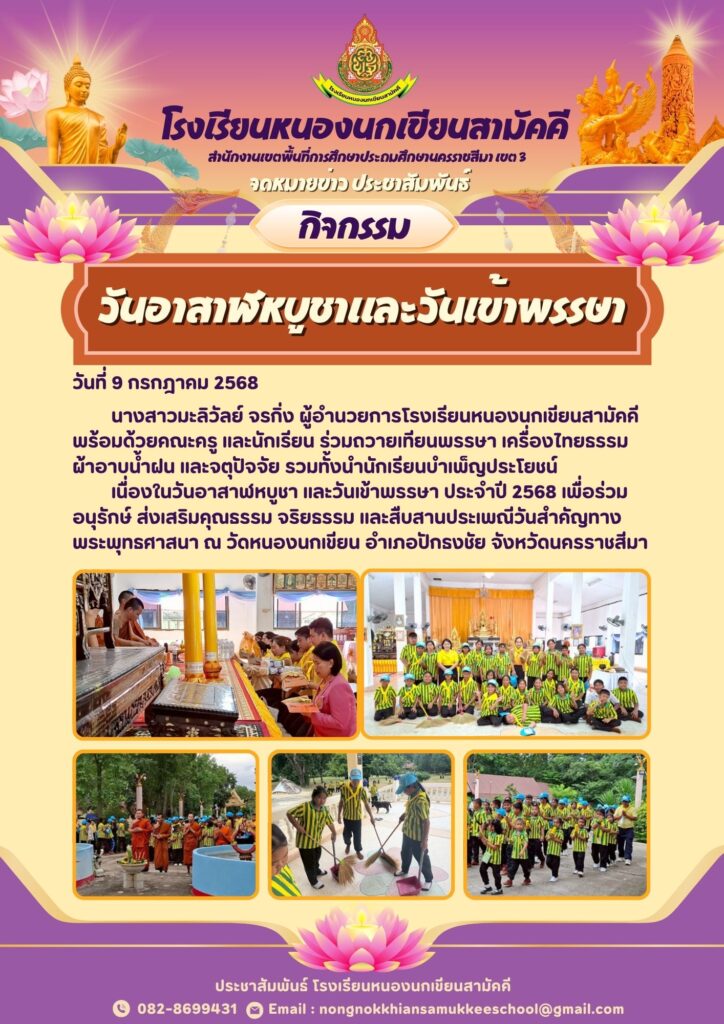 นางสาวมะลิวัลย์ จรกิ่ง ผู้อำนวยการโรงเรียนหนองนกเขียนสามัคคี พร้อมด้วยคณะครู และนักเรียน ร่วมถวายเทียนพรรษา เครื่องไทยธรรม ผ้าอาบน้ำฝน และจตุปัจจัย รวมทั้งนำนักเรียนบำเพ็ญประโยชน์ เนื่องในวันอาสาฬหบูชา และวันเข้าพรรษา ประจำปี 2568 เพื่อร่วมอนุรักษ์ ส่งเสริมคุณธรรม จริยธรรม และสืบสานประเพณีวันสำคัญทางพระพุทธศาสนา ณ วัดหนองนกเขียน อำเภอปักธงชัย จังหวัดนครราชสีมา