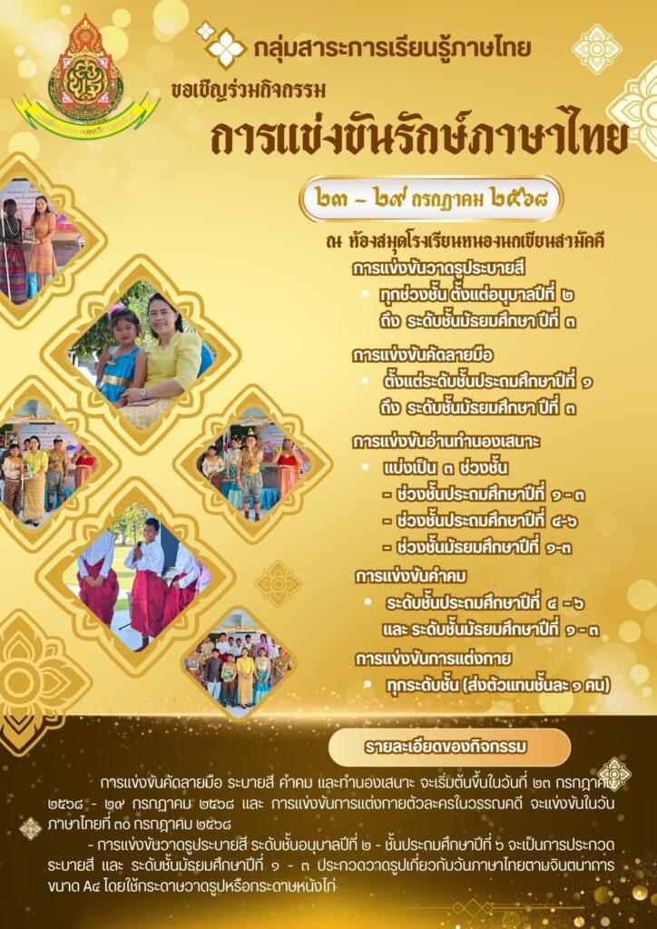 เนื่องในวันภาษาไทย ปีการศึกษา ๒๕๖๘ กลุ่มสาระการเรียนรู้ภาษาไทย ได้จัดกิจกรรมให้นักเรียนที่สนใจได้เข้าร่วม ประกอบด้วย.•.*![]()