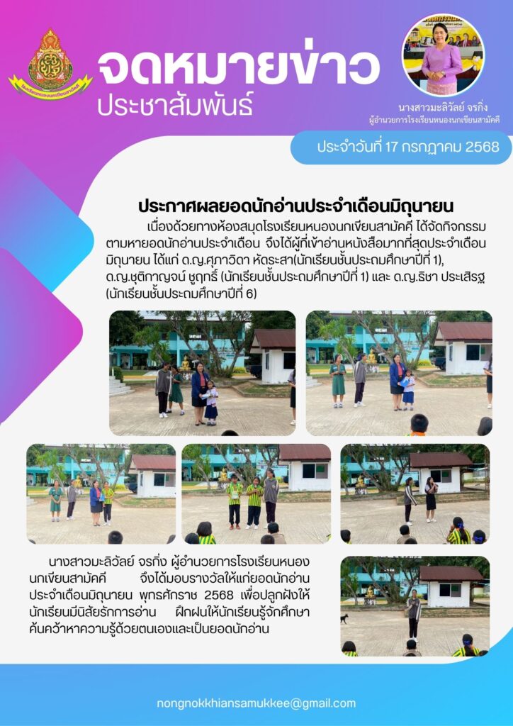 นางสาวมะลิวัลย์ จรกิ่ง ผู้อำนวยการโรงเรียนหนองนกเขียนสามัคคี จึงได้มอบรางวัลให้แก่ยอดนักอ่านประจำเดือนมิถุนายน พุทธศักราช 2568 เพื่อปลูกฝังให้นักเรียนมีนิสัยรักการอ่าน ฝึกฝนให้นักเรียนรู้จักศึกษาค้นคว้าหาความรู้ด้วยตนเองและเป็นยอดนักอ่าน อันได้แก่ ด.ญ.ศุภาวิดา หัดระสา(นักเรียนชั้นประถมศึกษาปีที่ 1), ด.ญ.ชุติกาญจน์ ชูฤทธิ์ (นักเรียนชั้นประถมศึกษาปีที่ 1) และ ด.ญ.ธิชา ประเสิรฐ (นักเรียนชั้นประถมศึกษาปีที่ 6)